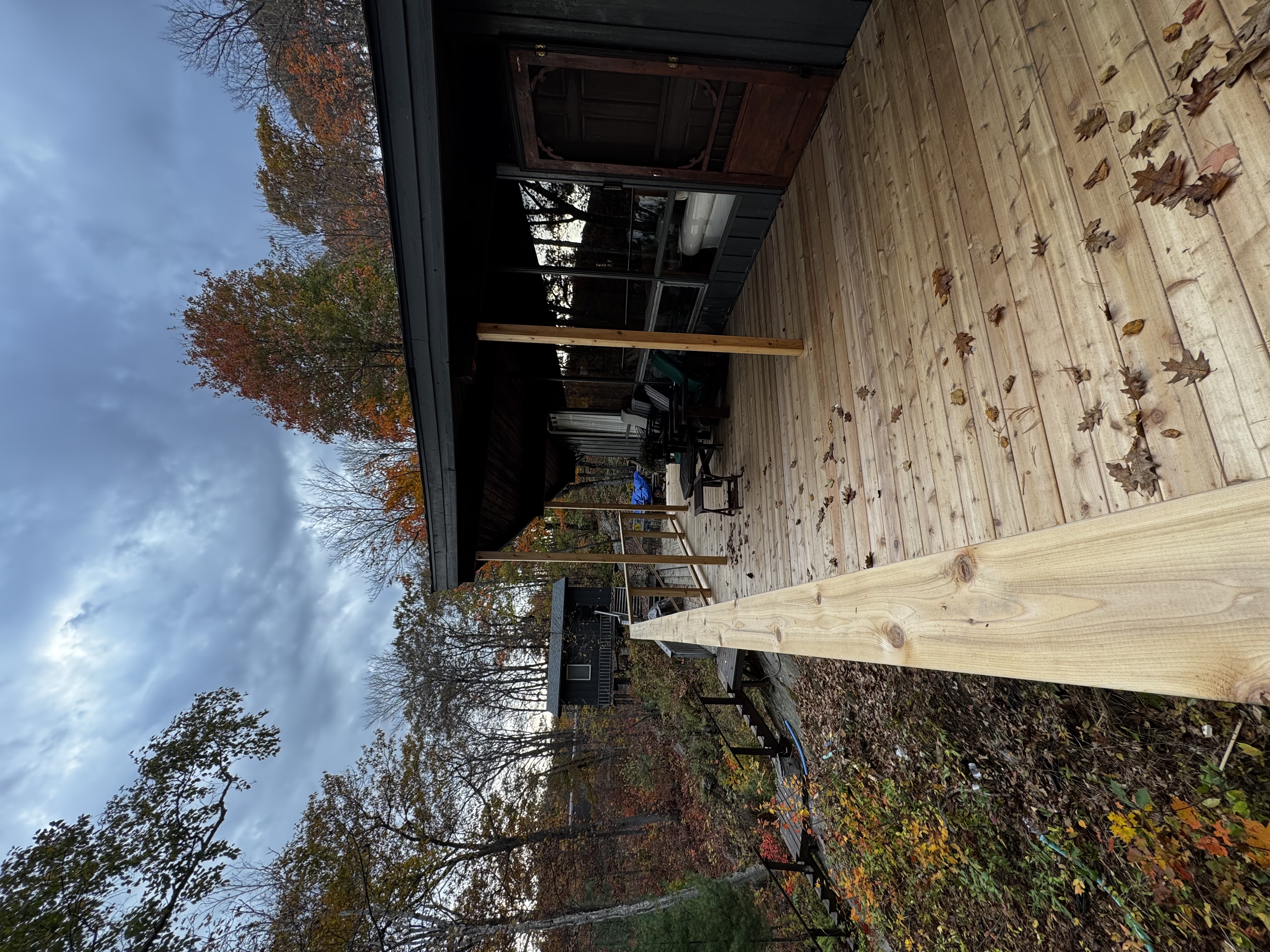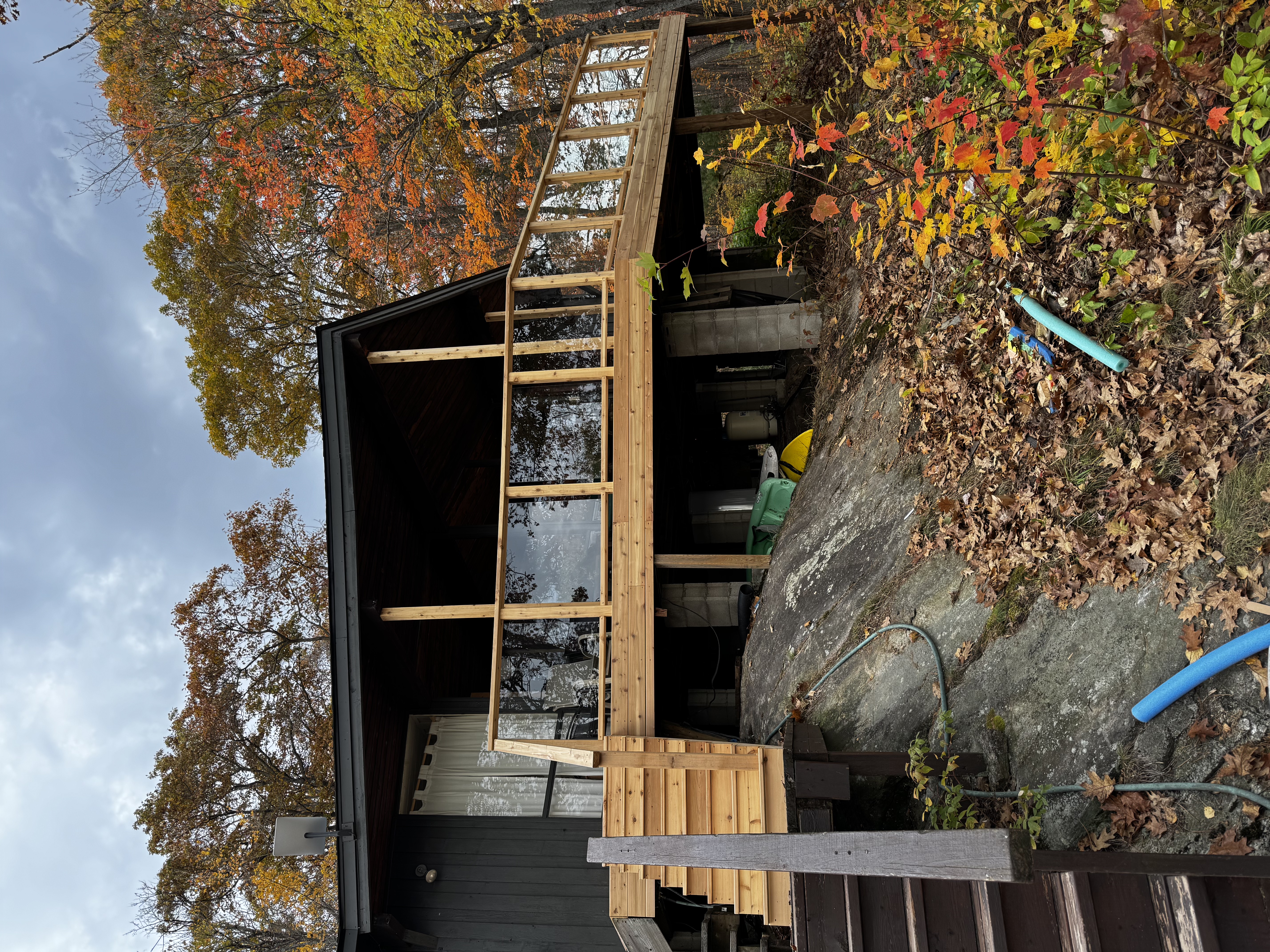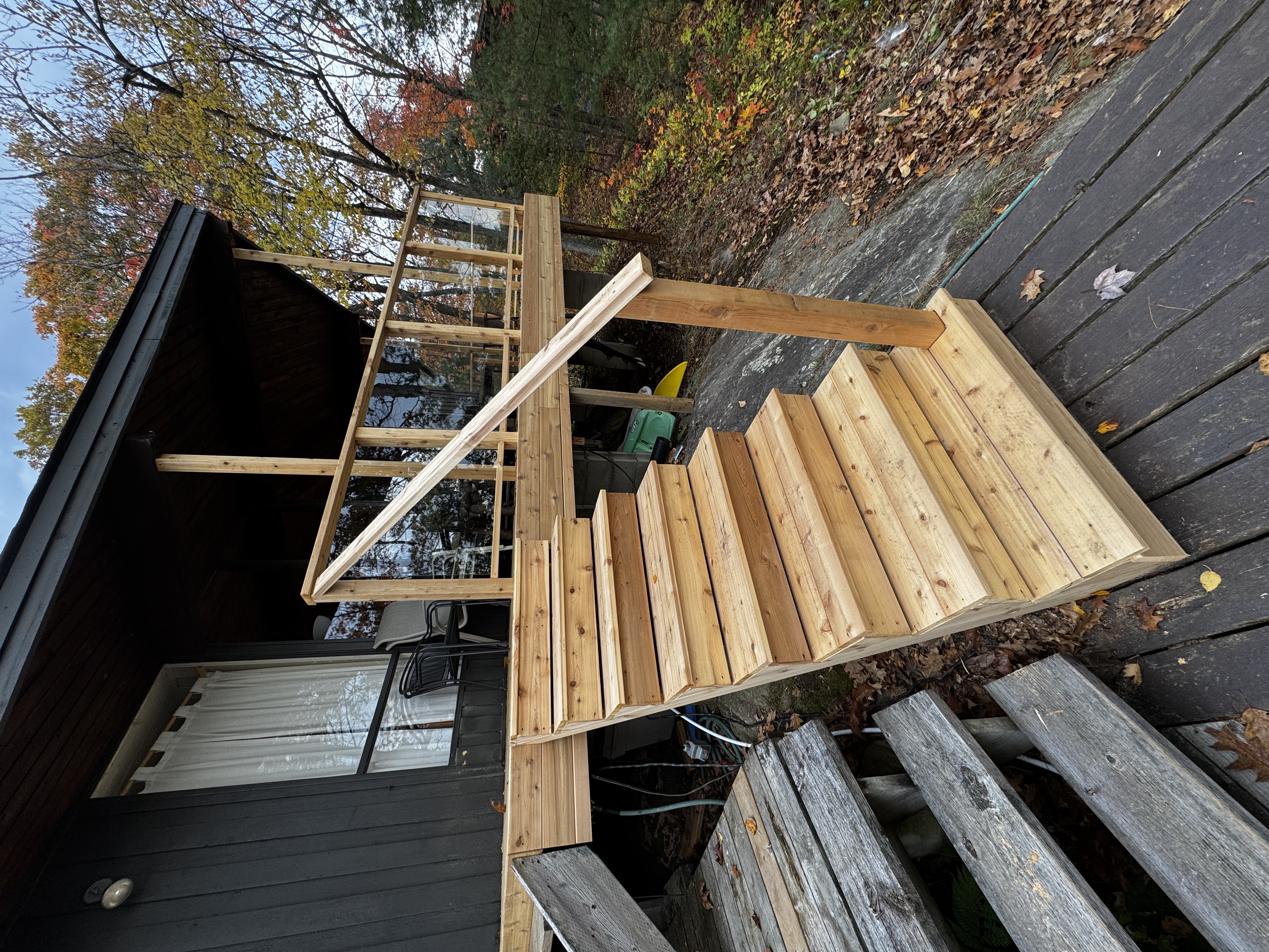 Complete teardown and rebuild of a waterfront boathouse deck and dock structure at a cottage on the shores of Seguin Township. The original structure had severely weathered, darkened wood that was structurally compromised after years of exposure to the elements. The project involved full demolition of the old decking and framing, followed by construction of a new cedar deck platform, staircase, and board-and-batten cedar cladding on the boathouse exterior. The finished result is a durable, attractive waterfront space perfectly suited to cottage life in Muskoka.